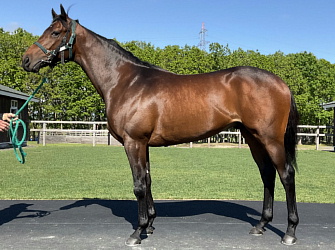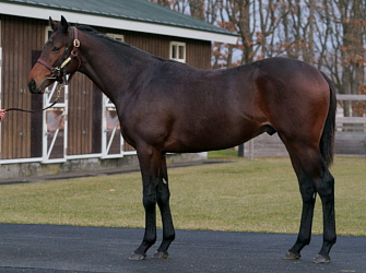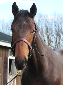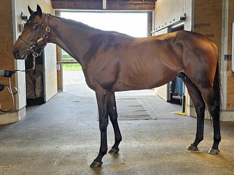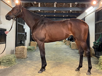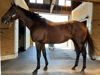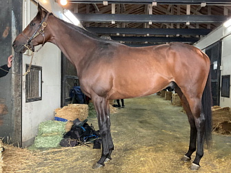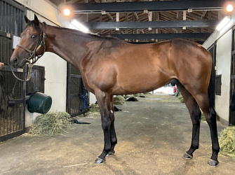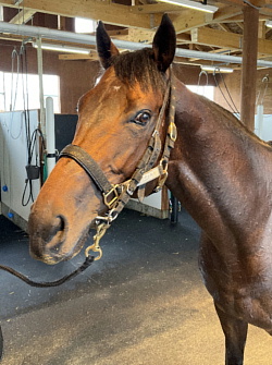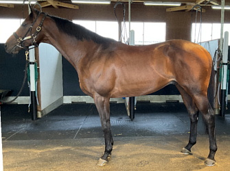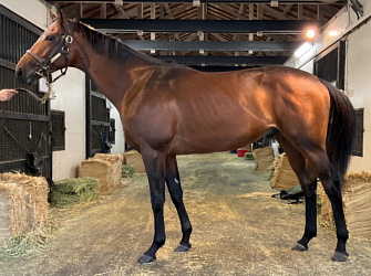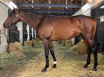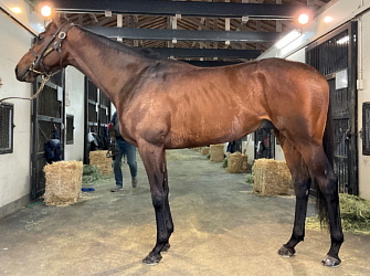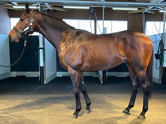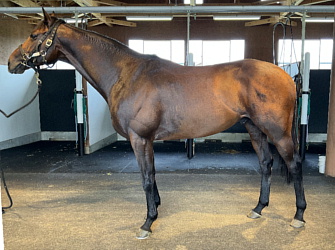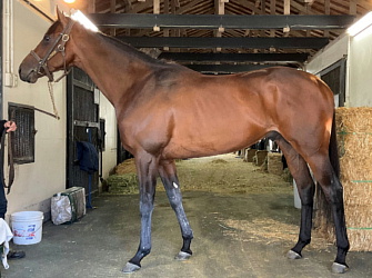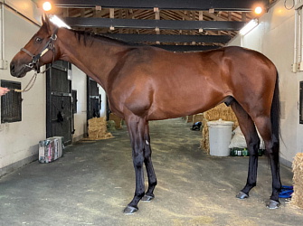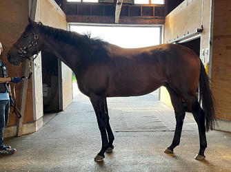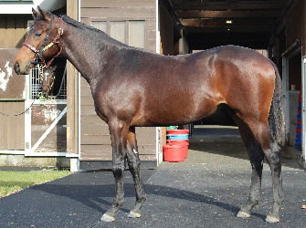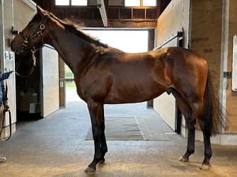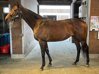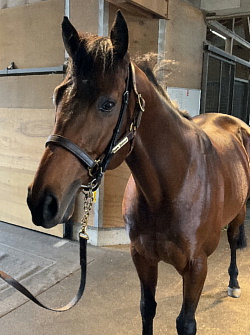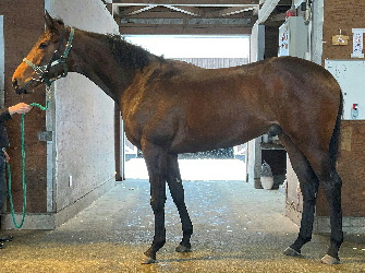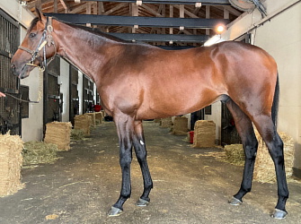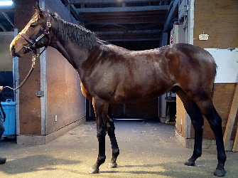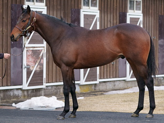 担当者の話では「初期馴致を終えてロンギ場での騎乗馴致を行っています。左前膝に腫れが見られたのですが、痛みなどは無く念のために行ったレントゲン検査でも異常はありませんでした。皮下の腫れと思われ、騎乗していても変化が無いことから、様子を見つつこのまま進めていくつもりです。もうしばらく騎乗に慣らし、基礎体力を付けた上で馬場入りを開始する予定です。馬っぷりも立派で楽しみです」とのこと。11月初旬の馬体重は483キロ。