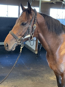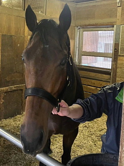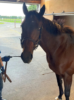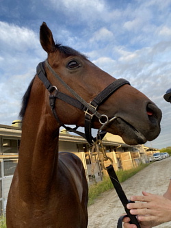 担当者の話では「到着後は環境に慣らしながら初期馴致を開始しています。環境の変化にもスムーズに対応出来、現在はウォーキングマシン調整と背慣らしを行っています。とても順調に来ています」とのこと。