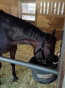 26日、牧場担当者から「現在は、ウォーキングマシン運動を継続しています。脚もとの状態も安定しているので、年明けから獣医と相談しつつ調整メニューを決めていきます。馬体重は544`」との連絡があった。