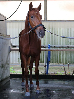 29日、竹内調教師から「現在は、ゲート練習をメインに進めています。今朝は枠入りから駐立、発馬まで行い、ゲートから反応良く飛び出しています。この様子なら、明日にでもゲート試験が受けられそうです。普段から人に従順で、飼い喰いも良好です。馬体重は484`」との連絡があった。